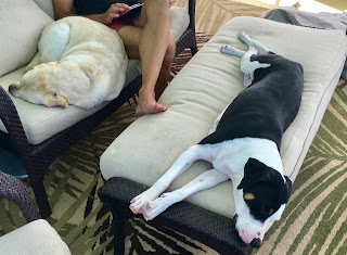 Mom heard a commotion and turned around to see the beach empty of the crew but Dad’s red shorts disappearing into the dunes way down the beach. She ran as fast as poor old Dylan could keep up. Turns out Dee Dee decided to run after a couple walking the beach and Dora somehow slipped her collar and joined in. Eventually, all dogs were corralled and beach time was over. The silver lining – Dee Dee and Dora were so tired they hardly pulled a bit on the way back. Dylan was dragging too.