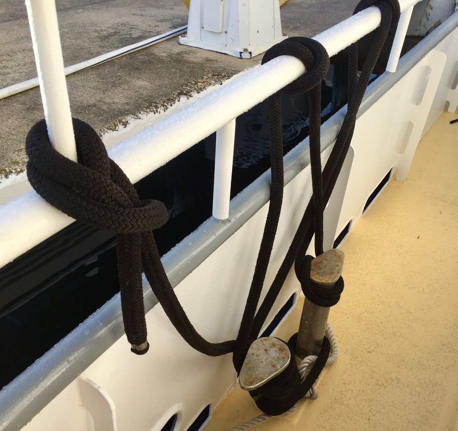 Given Dora’s Houdini ways, her dad constructed a maze of line to keep her from climbing between the rails and off the boat. Yes, she did that one day…