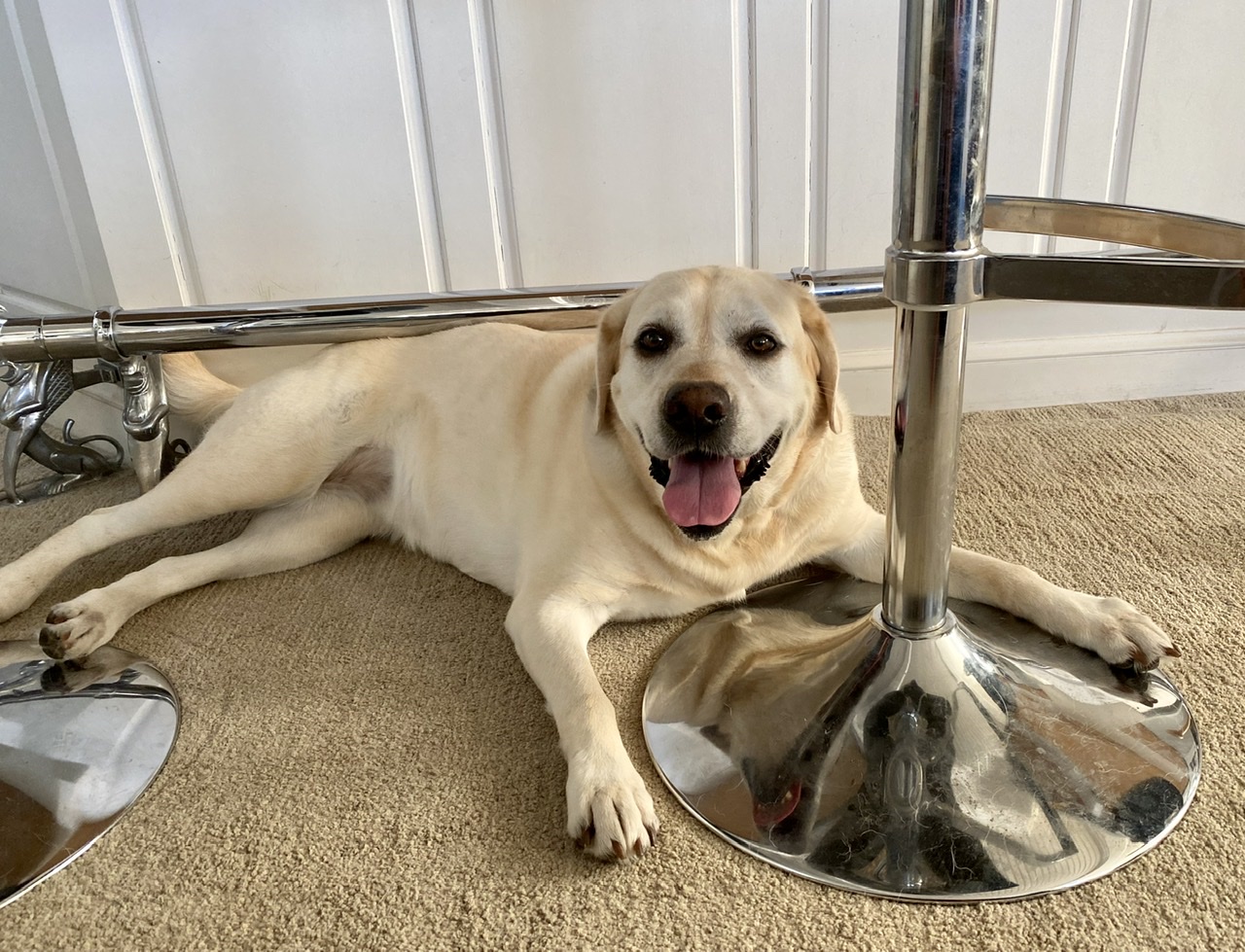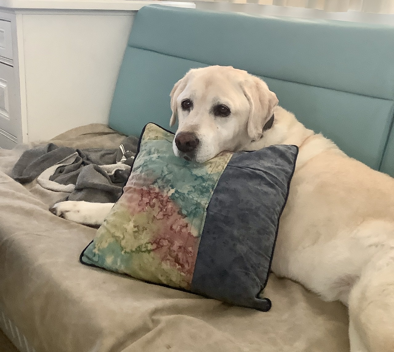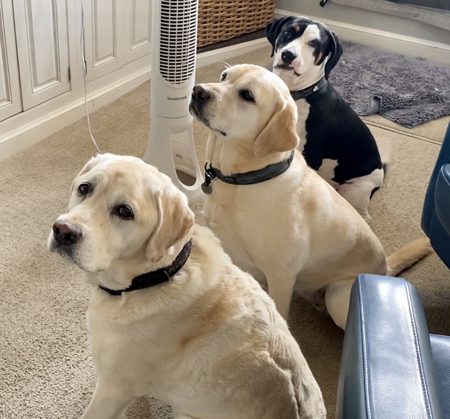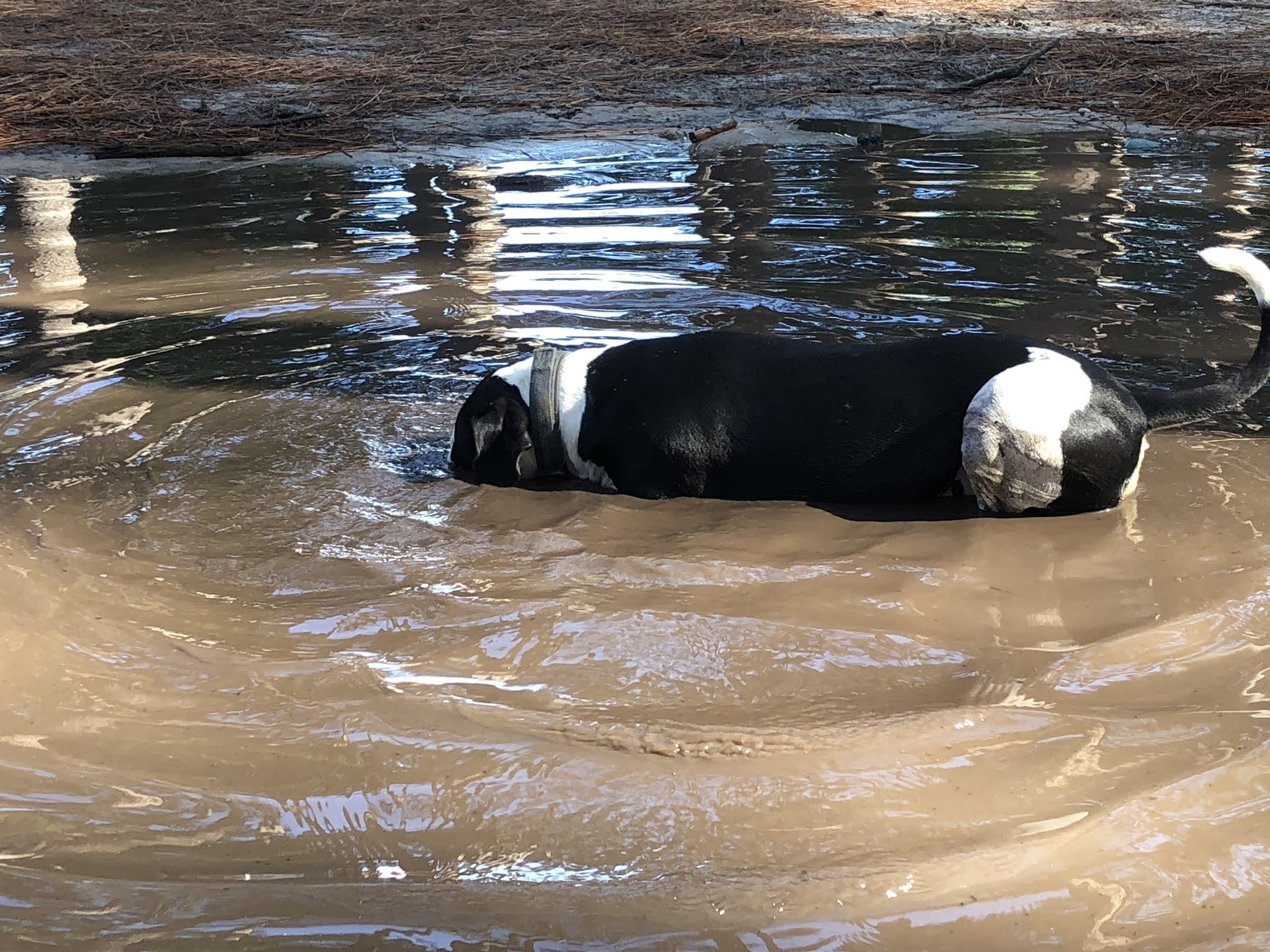 It rained last night, hard. At 9:36 am, Mom received a text from Dad, “Mud everywhere…” It’s an SOS concerning Dylan and Dora’s time at the dog park. Mom meets them on the deck of a Red Head with shampoo and towels.