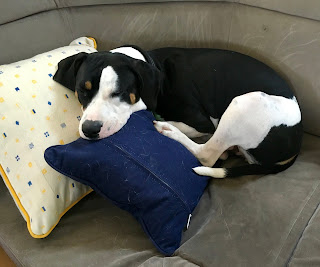 The new morning routine is as follows. Up (early) for breakfast, a bit of play time, and a snooze. Around 8 am, Mom takes Dylan for a walk on the waterfront promenade, before it gets hot. He loves sitting in the air conditioning when he returns.