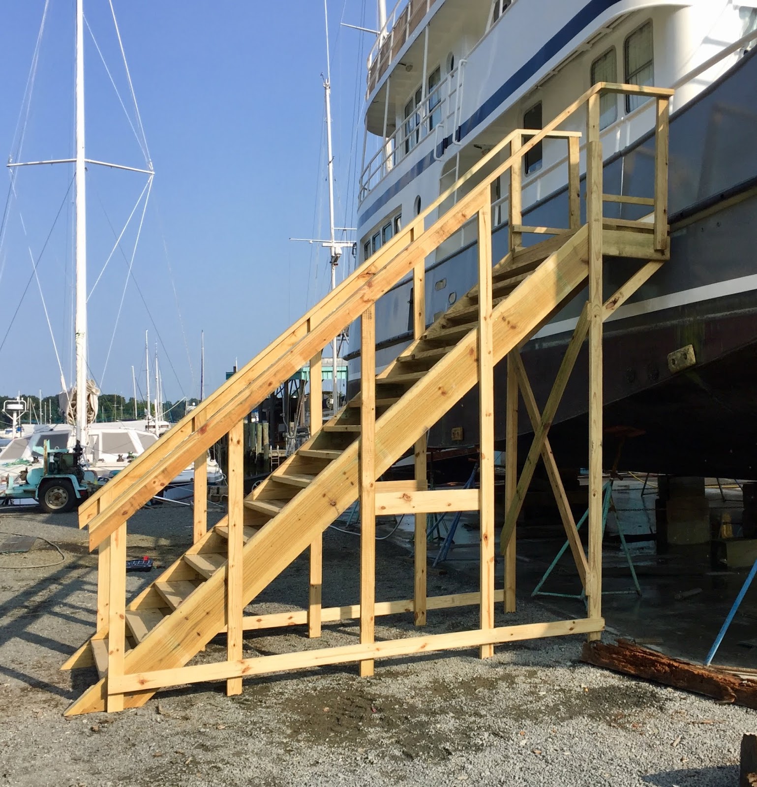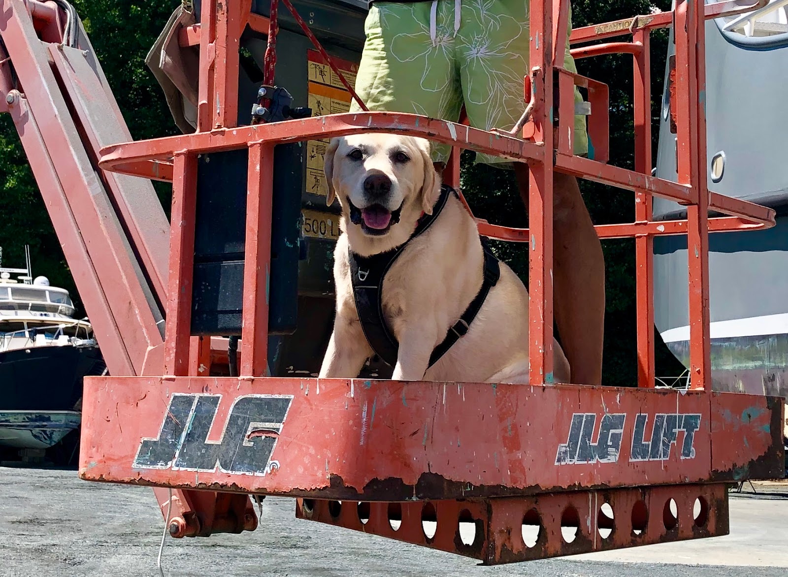 Three days on the hard meant getting the crew off and on the boat. We used a series of ramps, much like Stewart a couple years ago. Tried airplane stairs but Dylan would have none of that. On the final day, we used a lift to take them off one at a time prior to Red Head going back in the water.