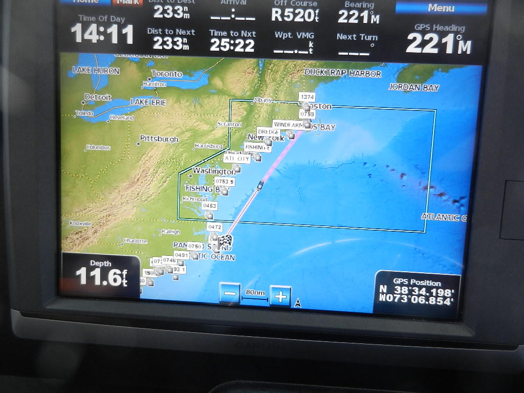 The weather forecast for the offshore waters between Montauk Point (Long Island New York) and Cape Hatteras showed 2 to 4 foot seas with a worst case of 3 to 5 footers and winds from a low to 5 knots to a high of 20 knots. Most important, no storms were in the forecast through Monday. Given that we would reach Morehead City on Saturday morning we had a two day margin of error. Our decision. Let’s go for it.