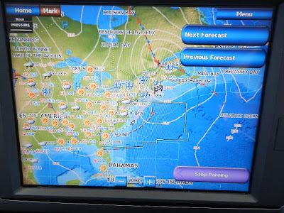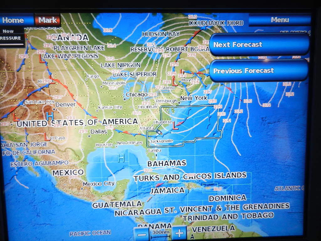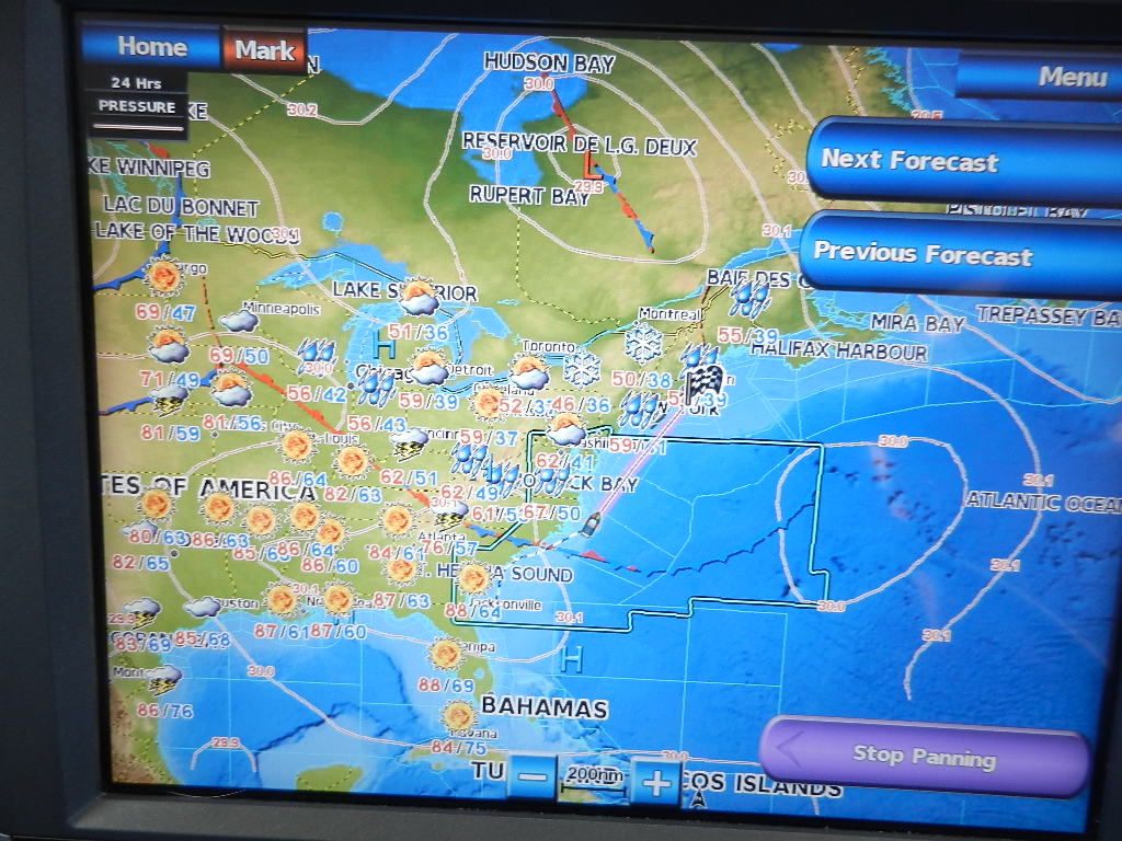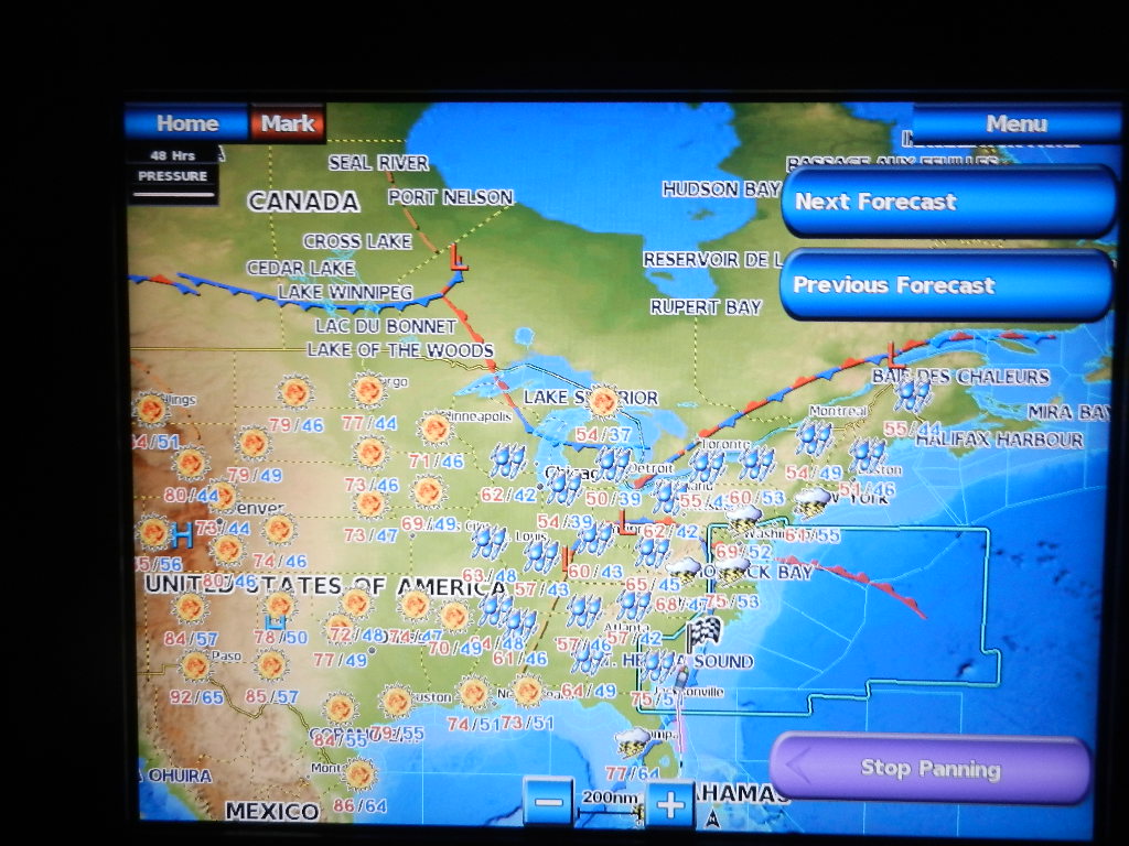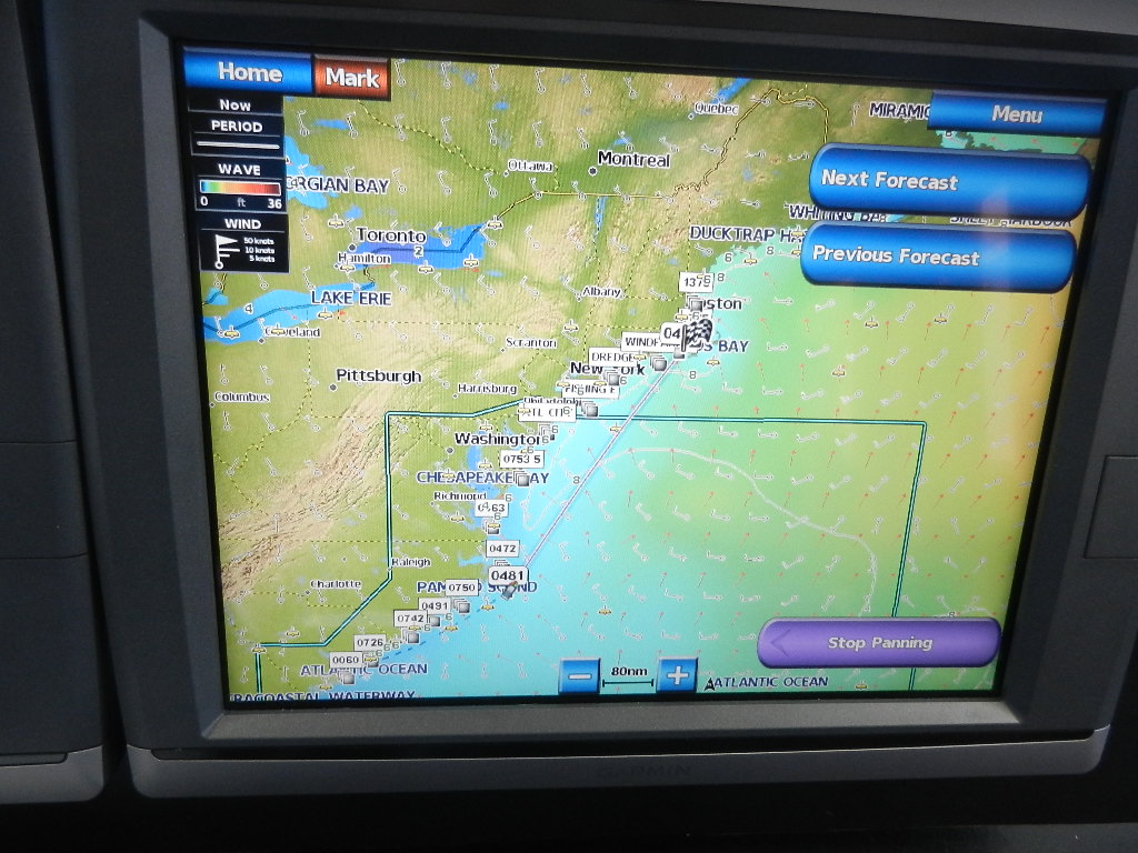 The two day weather layover in Georgetown allowed a massive low pressure system to work its way north and east. As it did, widespread high pressure from the Midwest took its place. The forecasts for our proposed route at departure from Georgetown on Sunday at 6:30 AM indicated 15 to 20 knot winds, mostly out of the southwest and west, with following seas 3 to 5 feet from Georgetown all the way to Cape Hatteras, some 213 nautical miles to the east northeast. For the rest of the 600 nautical miles to Massachusetts, the forecast called for diminishing winds and seas around 2 feet.