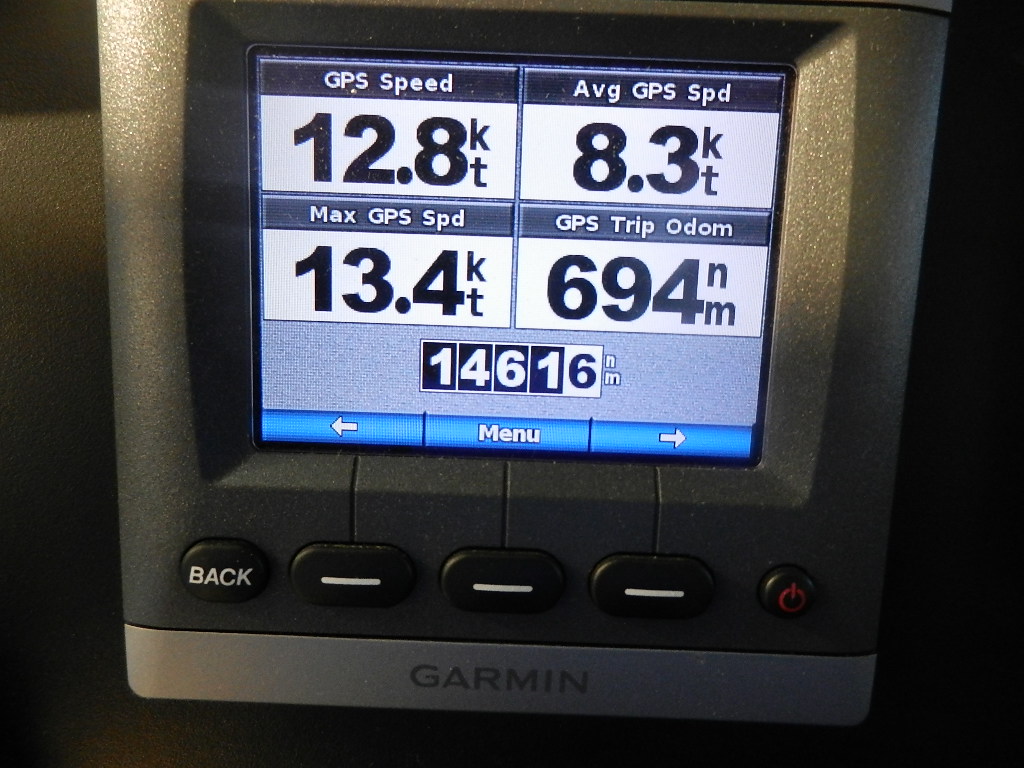 Explanatory Note: Running almost 100 miles from shore and more than 100 miles from a navigable inlet and shelter of a marina or anchorage is serious business. One should not undertake such a voyage without a weather window that covers the enroute period and even beyond. A “surprise” change in the weather does not leave many options when your boat’s cruising speed is 8.4 knots and its top speed is 13 knots with a 50 GPH fuel burn. Heading for shore/shelter is an 8 hour 400 gallon proposition at top speed (assuming you have enough fuel). Bottom line. A trawler like the 63 cannot out-run the weather. The “good news” (sort of) is that the 63 is rated “Ocean A – Unlimited.” She can handle anything – but why. The other consideration is mechanical reliability. Alongside of aggressive maintenance, we visit the engine room every 4 to 6 hours to verify the working of our machinery.