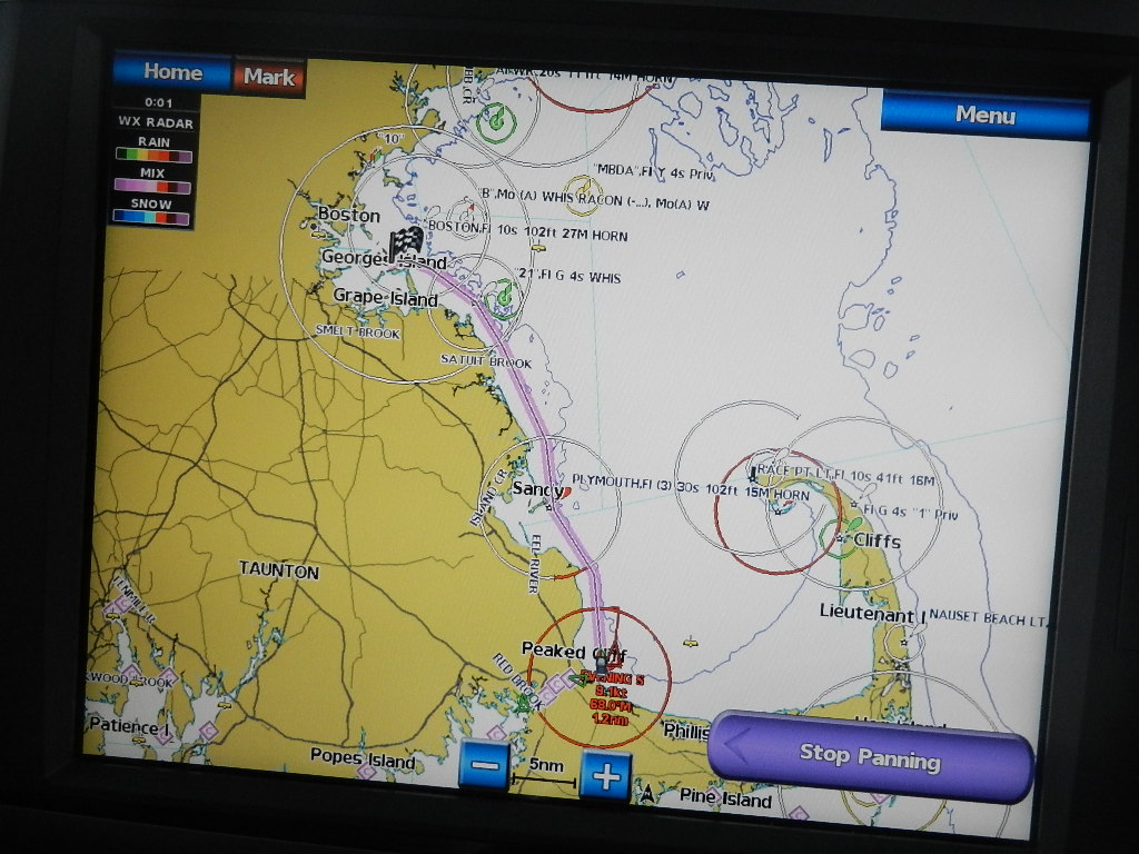 At the east end of the Cape Cod Canal we turned north and headed for Hingham. Five and a half hours later at 1:00 AM on Thursday Guided Discovery was sitting at the dock. We had hit the predicted arrival time that we predicted three days earlier to the minute.